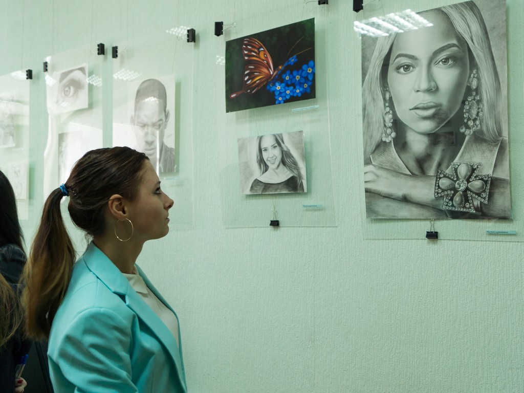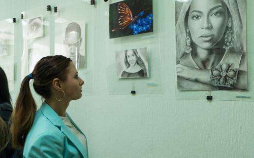 На выставке в читальном зале библиотеки представлены рисунки разных лет. Например, портрет певицы Бейонсе Ноулз был закончен накануне торжественного открытия.