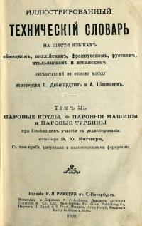 Научно-библиографический отдел библиотеки ИГЭУ приглашает читателей познакомиться с новым изданием из цикла «Книжные редкости».  На этот раз представлено многотомное издание из коллекции библиотеки Рижского политехнического института, изданное на 6 языках и отражающее «обширную область котельного производства и постройки паровых машин и паровых турбин»:  «Иллюстрированный Технический Словарь» (СПб., 1908). Том 3: «Паровые котлы, паровые машины и паровые турбины» подготовлен инженерами К. Дейнгардтом и А. Шломаном.