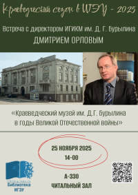 25 ноября в 14:00 в читальном зале научной литературы (А-330) состоится встреча с директором Ивановского государственного историко-краеведческого музея имени Д. Г. Бурылина Дмитрием Львовичем Орловым на тему «Краеведческий музей им. Д. Г. Бурылина в годы Великой Отечественной войны». Присоединяйтесь к краеведческому лекторию и открывайте новые грани истории нашего региона!