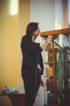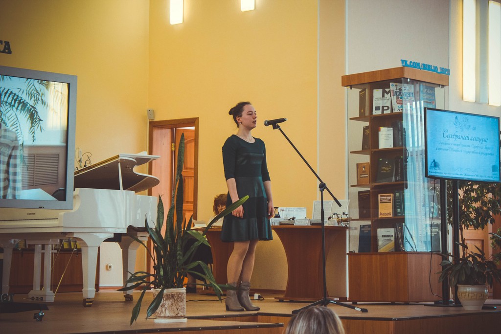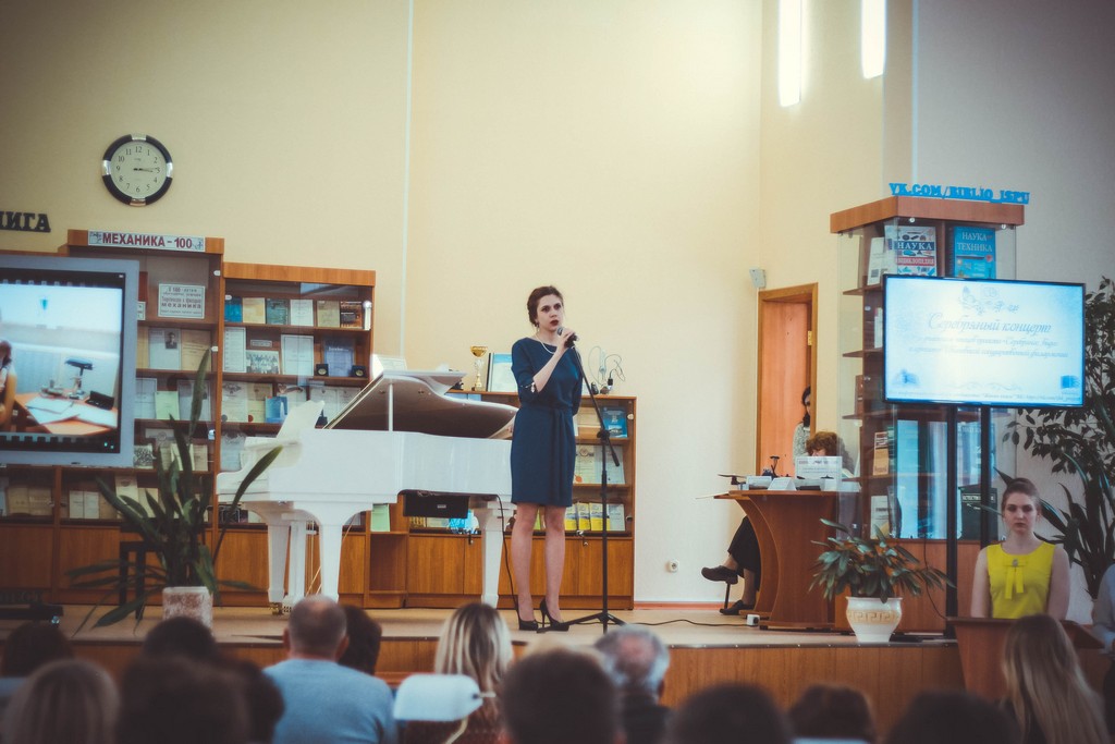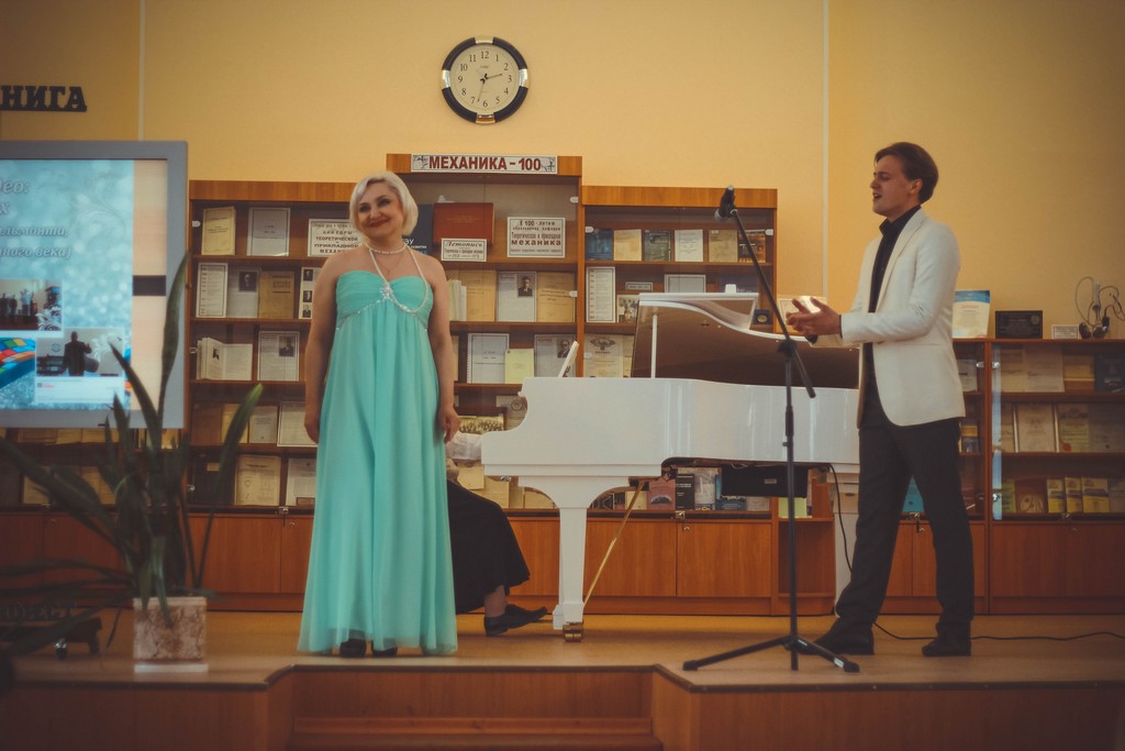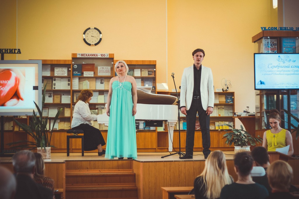 Мероприятие открыли видеоприветы от именитых участников «Серебряного видео» - артиста Ивановского драмтеатра Евгения Семёнова и руководителя ансамбля «Светилен», композитора Дмитрия Гаркави. Программу «Серебряного концерта» украсили музыкальные произведения XIX и начала ХХ веков, прозвучавшие в исполнении Агнессы Воронцовой и солистов Ивановской государственной филармонии – Максима Коновалова, Елены Лихачевой, Екатерины Пирвердян, Ольги Тихомоловой (вокал) и почетного работника культуры региона, лауреата премии Губернатора «За личный вклад в развитие культуры» Валерии Сабуровой (фортепиано). Главной героиней «Серебряного концерта» стала Поэзия. Открывая «дверь» в Серебряный век, стихи Брюсова и Анненского прочли Иван Ракутин (1-3а) и Алена Рожкова (4-45), тему блестящих литературных розыгрышей и мистификаций через творчество Елизаветы Дмитриевой (Черубины де Чабриак) представила директор студгородка Надежда Логачева. Трагическая история любви Ахматовой и Гумилева развернулась в стихах, исполненных поэтом, ведущим методистом Областного центра культуры и творчества Татьяной Прокофьевой и студентками ИГЭУ Настей Шабулкиной (1-2) и Настей Железновой (3-1). Очень разные по времени создания и настроению стихи Марины Цветаевой исполнили Варвара Перфильева (1-13) и Алексей Галкин (1-2). Примечательно, что в качестве почетной гостьи концерт посетила участница проекта «Серебряное видео», директор Музея Семьи Цветаевых Александра Полякова. Поэтическое превращение нашего земляка, уроженца Шуйского уезда Константина Бальмонта в лидера российского символизма слушатели пережили вместе с писателем и сотрудницей ИГЭУ Дарьей Зарубиной. Затем гости мероприятия стали свидетелями «поэтической дуэли» Сергея Есенина и Владимира Маяковского. Стихотворную битву провели Егор Либизов (1-2), Руслан Тимаев (1-36) и Евгения Фомина (1-45). Стихи Владислава Ходасевича, Ивана Бунина, Владимира Соловьева на «Серебряном концерте» прозвучали в форме романсов. Творчеству «последнего поэта» Серебряного века – Арсения Тарковского – посвятила своё выступление инженер-программист ИГЭУ Ольга Гурфова. А «символический мост» между Серебряным веком и современностью проложила Полина Королева (1-4), исполнившая стихотворение любимого ученика Анны Ахматовой – Иосифа Бродского. Ведущими прекрасного литературного путешествия в мир поэзии Серебряного века стали руководитель объединения «Живая книга», студентка ТЭФа Анастасия Железнова и руководитель «Сообщества буккроссеров ИГЭУ», магистрант ИВТФ Влад Ершов. В завершении программы они отметили, что всего в рамках проекта «Серебряное видео» прозвучало больше 60-ти стихотворений, и почти для каждого из них был создан ролик. Слова благодарности за монтаж видеороликов прозвучали в адрес сотрудников библиотеки – Марии Трефиловой, Любови Кольцовой, Татьяны Барцевой, Анны Шевченко и Екатерины Хабаровой.